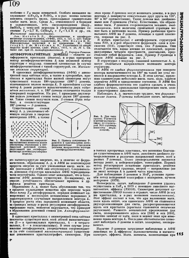 В одноосных антиферромагнетиках (АФМ) с анизотропией типа «л╦гкая ось», а также в орторомбич. кристаллах и кристаллах более низкой симметрии могут существовать только 180-градусные (180°-) домены, отличающиеся знаком вектора L,. В простейшем случае вектор JL ранен разности намагниченности днух подре-ш╦ток магнитных, т. о, 180°-домены отличаются только нумерацией подреш╦ток. На рис. 1 приведена двухмерная модель доменной стенки между двумя 180°-доменами. Такие стенки получили назв. £-стенок (Spin rotation), а соответствующие 180°-домены ≈ 5-доменов.