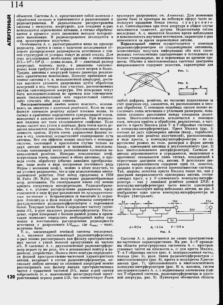 Особенности А, с. рассматриваются ниже на примере радиоастр, систем в связи с задачами исследовании углового распределения радиояркости источников с тон-кон структурой от угловых минут до долей секунд. Для этих исследований необходимы антенны с отношением £>/Л~103ч-10в (Л. ≈ длина волны, D ≈ линейный размер апертуры), поэтому, напр.т в диапазоне сантиметровых волн требуется D порядка сотой метров и более. Традиц. антенны с апертурой такого диаметра реализовать практически невозможно. Поэтому применяют антенные системы с т. н. незаполненной апертурой, достигая высокого углового разрешения пут╦м обработки измерений в отд. точках или участках, расположенных внутри синтезируемой апертуры. Эти измерения могут быть последовательными во времени или одновременными (последовательный или параллельный синтез) либо сочетать оба вида синтеза.