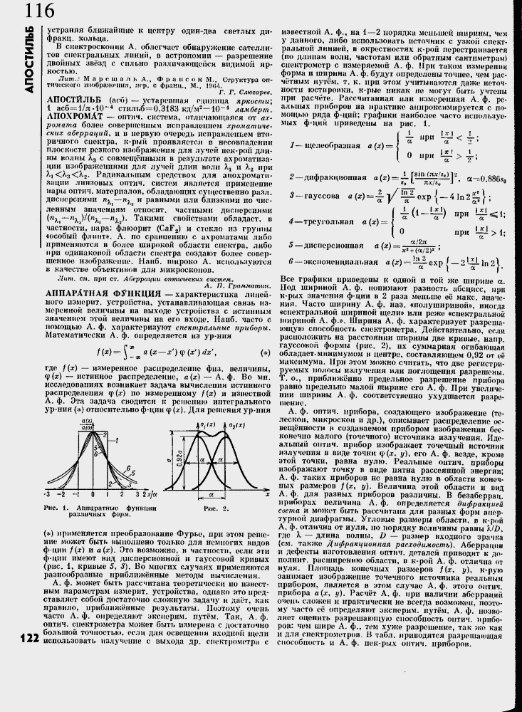 А, ф. оптич. прибора, создающего изображение (телескоп, микроскоп и др.)» описывает распределение освещ╦нности в создаваемом прибором изображении бесконечно малого (точечного) источника излучения. Идеальный оптич. прибор изображает точечный источник излучения в виде точки ф(.г, у), его А. ф. везде, кроме этой точки, равна нулю. Реальные онтич. приборы изображают точку в виде пятна рассеянной энергии; А. ф. таких приборов не равна нулю в области конечных размеров /(.с, у]. Величина этой области и вид А. ф, длн разных приборов различны. В безаберрац. приборах величина А. ф. определяется дифракцией света и может быть рассчитана для разных форм апор-турной диафрагмы. Углоные размеры области, в к-рий А. ф. отлична от нуля, по порядку величины равны KID, где \ ≈ длина полны, D ≈ размер входного зрачка (см. такжо Дифракционная расходимость). Аберрации и дефекты изготовления оптич. деталей приводят к дополнит. расширению области, в к-рой А. ф. отлична от нуля. Площадь конечных размеров f(x, у), к-рую занимает изображение точечного источника реальным прибором, является в этом случае А. ф. этого оптич. прибора а(х, у]. Расч╦т А, ф. при наличии аберрации очень сложен и практически нв всегда возможен, поэтому часто с╦ определяют окспсрнм. пут╦м. А. ф. позволяет оценить разрешающую способность оптич. приборов: чем широ А. ф.т тем хуже разрешение, так жо как и для спектрометров. В табл. приводятся разрешающая способность и А. ф, нек-рых оптич. приборок.