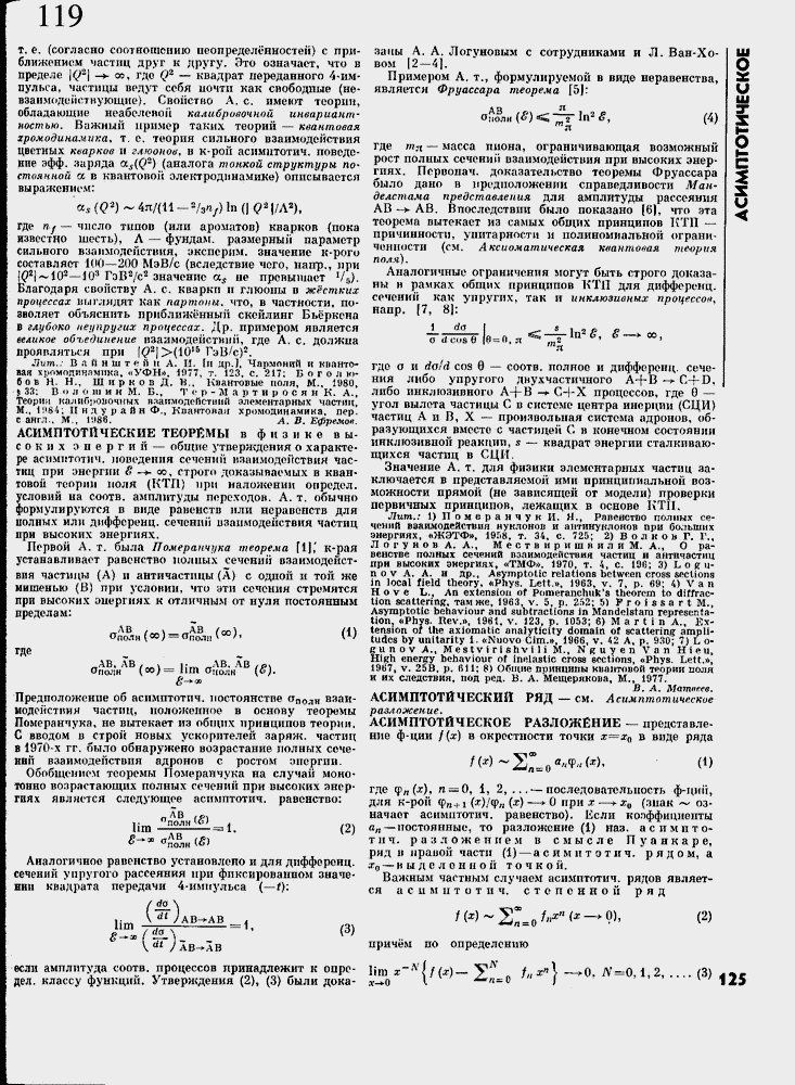 АСИМПТОТИЧЕСКИЕ ТЕОРЕМЫ в физике высоких энергий ≈ общие утверждения о характере асимптотич. поведения сечений взаимодействия частиц при энергии £ ≈*- оо, строго доказываемых в квантовой теории поля (КТП) при наложении определ. условий иа соотв. амплитуды переходов. А. т. обычно формулируются в виде равенств или неравенств для полных или диффсренц. сечений взаимодействия частиц при высоких энергиях.