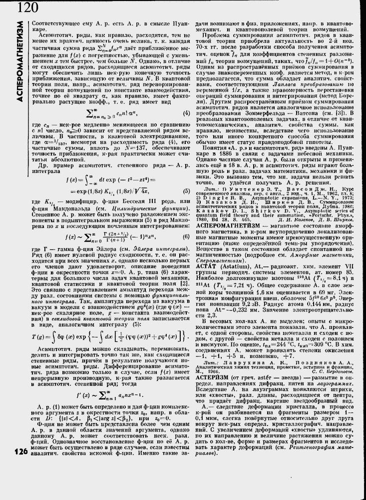 где Г ≈ гамма ф-ция Эйлера (см. Эйлера интегралы,}. Ряд (6) имеет нулевой радиус сходимости, т. е. он расходится при всех значениях т, однако несколько первых его членов дают удовлетворит, описание поведения ф-дии в окрестности точки х≈0. А, р, типа (6) характерны для большого числа задач квантовой механики, квантовой статистики и квантовой теории поля [2]. Это связано с представлением амплитуд перехода между разл. состояниями системы с помощью функционального интеграла. Так, амплитуда перехода из вакуума в вакуум в модели с взаимодействием #ф*(оз) (где <р(х) ≈ нек-рос скалярное поле, g ≈ константа взаимодействия) в евклидовой квантовой теории поля Записывается в виде, аналогичном интегралу (5):