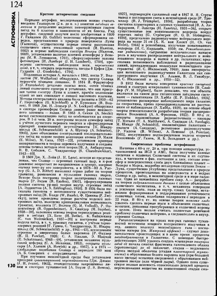1927], подтвержд╦н сделанный ещ╦ в 1847 В. Я. Струве вывод о поглощении света в межзв╦здной среде [Р. Трвд-мплер (R. J. Trumpler), 1930], разработана теория свечения планетарных и газовых туманностей [В. А. Амбарцумян, Г, Занстра (TI. Zanstra), 1931≈34], открыто существование зон ионизованного водорода вокруг горячих зв╦зд (Б. Стр╦мгрен (R. G. D. Strbmgren)r 1939], предсказано радиоизлучение нейтрального водорода на волне 21 см [X. К. ван Хюлст (H. Ch. van Hnlst), 1944J и рскомбинац. излучение ионизованного водорода (Н, С. Кардаш╦в, 1959; см. Рекомбинацион-нш радиолинии}, сыгравшие исключительно важную роль в изучении распределения нейтрального и ионизованного водорода в нашей и др, галактиках; предсказана возможность наблюдений в радиодиапазоне линий, принадлежащих молекулам межзвездного пространства (И. С. Шклонскин, 1949), дана интерпретация нетеплового радиоизлучения Галактики как син-хротронного излучения (X. Альвен, В. Л. Гинзбург, И. С. Шкловский и др., 1950≈52),