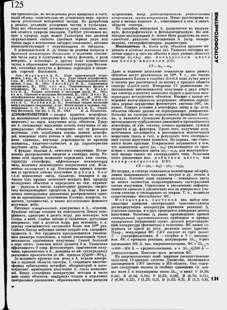 Даже в видимом диапазоне показатели цвета разных объектов могут различаться на 10м. Т. е., две звезды одинакового блеска в голубых (Ас^0,4 мкм) лучах могут в тысячи раз различаться по потоку в красной области спектра (А~0,8 мкм). Измерений CI равносильно сопоставлению интснсивностей излучения в двух участках спектра и поэтому позволяет судить о цветовых температурах исследуемых объектов. Именно с целью измерения колор-индексов астрономич. объектов зародились первые двуцветные фотомстрич. системы (ФС, см. ниже). Однако условия в атмосферах зв╦зд и др. астр. объектов обычно далеки от термодинамич. равновесия. Поэтому их спектры не определяются функцией Планка, а являются сложными функциями ОТ светимости, интенсивности турбулентных движений и протяж╦нности атмосферы, е╦ хим. состава, осевого вращения, лучевой скорости и др. факторов. Кроме того, излучение астр. источников поглощается и рассеивается межзв╦здным веществом (пыль и газ), в результате чего спектральный состав излучения меняется. Во-первых, оно становится более красным. Покраснение яыражается в том, что показатель цвета (щ≈wa) увеличивается по сравнению с покавателом цвета (т1≈m2)Q для нснптсраспев-шей звезды такого же спектрального типа. Величина этого увеличения наз. избытком цвет а, или к о л о р - э к с ц е с с о м (СЕ}: