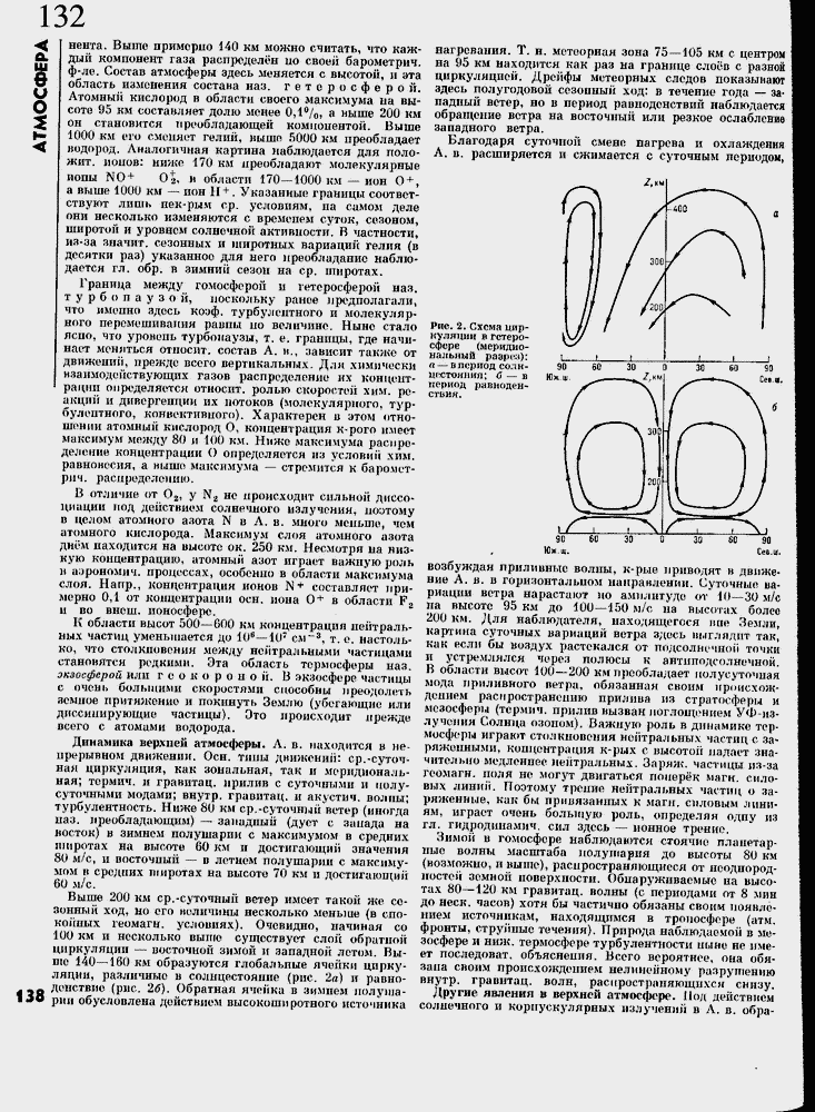 Выше 200 км ср.-суточный ветер имеет такой же сезонный ход, но его величины несколько меньше (в спокойных геомагн. условиях). Очевидно, начиная со 100 км и несколько выше существует слой обратной циркуляции ≈ восточной зимой и западной летом. Выше 140≈160 км образуются глобальные ячейки циркуляции, различные в солнцестояние (рис. 2я) и равноденствие (рис. 26). Обратная ячейка в зимнем полушарии обусловлена действием, высокоширотного источника