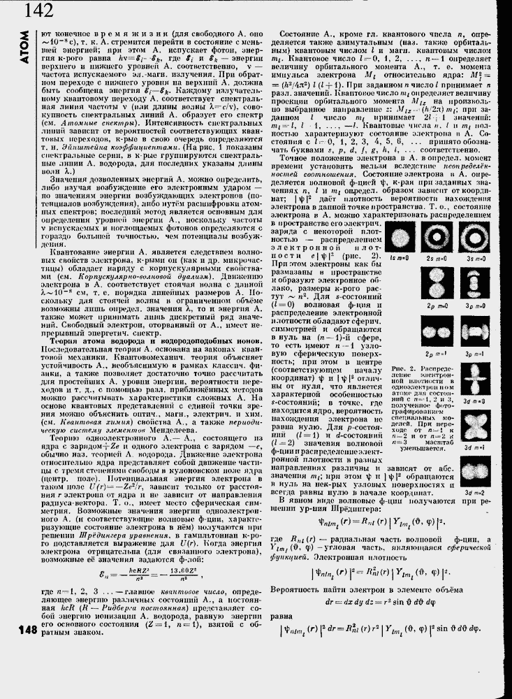 Точное положение электрона в А. в определ. момент времени установить нельзя вследствие неопредел╦нностей соотношения. Состояние электрона к А. определяется полковой ф-цией t|i, к-рая при заданных значениях п, I и mi ошредел. образом зависит от координат; 11|> |2 да╦т плотность вероятности нахождения электрона в данной точке пространства. Т.о., состояние электрона в А. можно характеризовать распределением в пространстве его элсктрич. заряда с некоторой плотностью ≈ распределением электронной плотности е \\ i|? |2 (рис. 2), При этом электроны как бы размазаны н пространстве и образуют электронное облако, размеры к-рого растут ~ п2. Для я-состояний (£ = 0) волновая ф-цпя и распределение электронной плотности обладают сфернч. симметрией и обращаются в нуль на (ге ≈1)-й сфере, то есть имеют n ≈ i узловую сферическую поверхность; при этом в центре (соответствующем началу координат) 1|? и 11[? |3 отличны от нуля, что является характерной особенностью s-состояний; в точке, где находится ядро, вероятность нахождения электрона не равна нулю. Для р-состоя-ний (1 = 1) и d-состояшш (I ≈ 2) значения волновой ф-ции л распределение электронной плотности в разных направлениях различны и зависят от абс. значения mf; при этом ij? н |\\|>|2 обращаются в нуль на нек-рых узловых поверхностях и всегда равны нулю в начале координат.