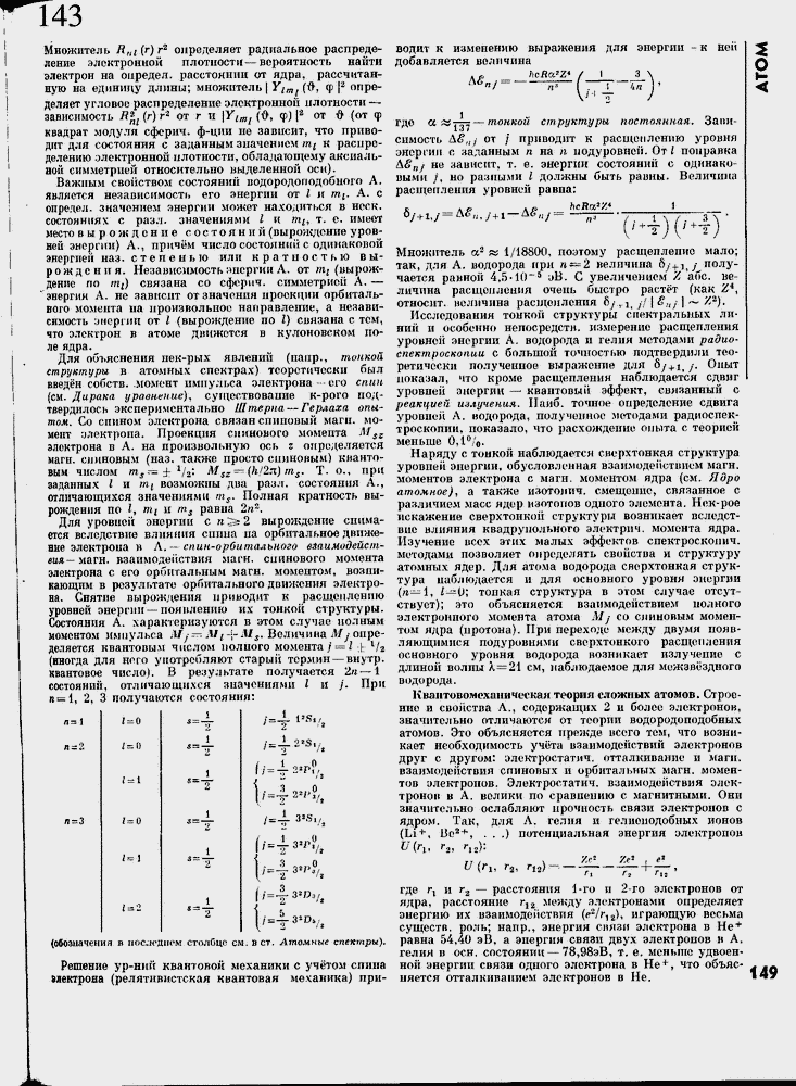 Для уровней энергии с п S? 2 вырождение снимается вследствие влияния спина па орбитальное движение электрона в А. ~ спин-орбитального взаимодействия≈ магн. взаимодействия магн. спинового момента электрона с его орбитальным магн. моментом, возникающим в результате орбитального движения электрона. Снятие вырождения приводит к расщеплению уровней энергии ≈появлению их тонкой структуры. Состояния А, характеризуются в этом случае полным моментом импульса Л/у ≈ Д/^-Д/^. Величина А/7 определяется квантовым числом полного момента/ = Z -: 1/2 (иногда для него употребляют старый термин ≈ внутр. Квантовое число). В результате получается 2« ≈ 1 состояний, отличающихся значениями I и у. При а=1, 2, 3 получаются состоянии: