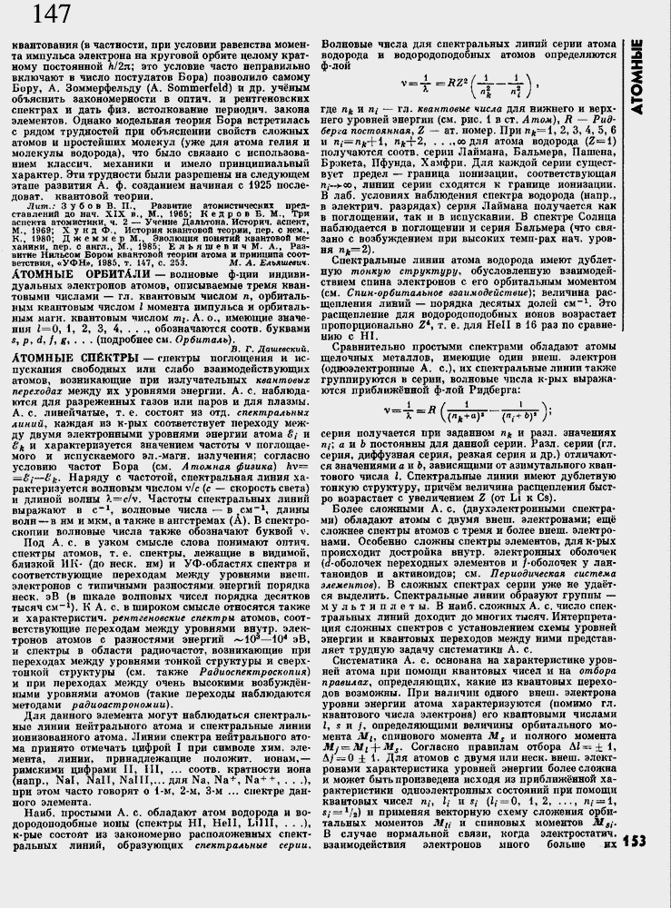 квантования (в частности, при условии равенства момента импульса электрона на круговой орбите целому кратному постоянной Л/2л; это условие часто неправильно включают в число постулатов Бора) позволило самому Бору, А. Зоммерфельду (A, Sommerfeld) и др, уч╦ным объяснить закономерности в оптич. и рентгеновских спектрах и дать физ. истолкование периодич. закона элементов. Однако модельная теория Бора встретилась с рядом трудностей при объяснении свойств сложных атомов и простейших молекул (уже для атома гелия и молекулы водорода), что было связано с использованием классич, механики и имело принципиальный характер. Эти трудности были разрешены на следующем этапе развития А, ф. созданием начиная с 1925 после-