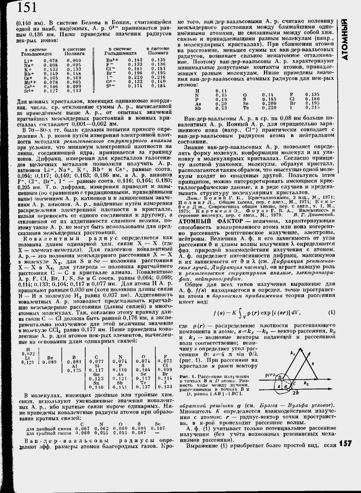 В 70≈80-х гг. были сделаны попытки прямого определения А. р. попов пут╦м измерения электронной плотности методами рентгеновского структурного анализа при условии, что минимум электронной плотности на линии, соединяющей ядра, принимается за границу ионов. Дифракц. измерения для кристаллов галогени-дов щелочных металлов позволили получить А. р. катионов Li + , Na + T К h, Rb+ и Сэ4', равные соотв, 0,094; 0,117; 0,149; 0,163; 0,186 нм, а А. р. анионов F-, С1-, Вг-т I" ≈ равные соотв. 0,116; 0,164; 0,180; 0,205 нм. Т. о. дифракц. измерения приводят к завышенным (но сравнению с традиционными, привед╦нными выше) значениям А. р. катионов и к заниженным значениям Л. р. анионов. А. р., найденные пут╦м измерения распределения электронной плотности в кристалле, нельзя переносить от одного соединения к другому, а отклонения от их аддитивности слишком нолики, поэтому такие А. р. не могут быть использованы для ирод-сказания межъядерпых расстояний,