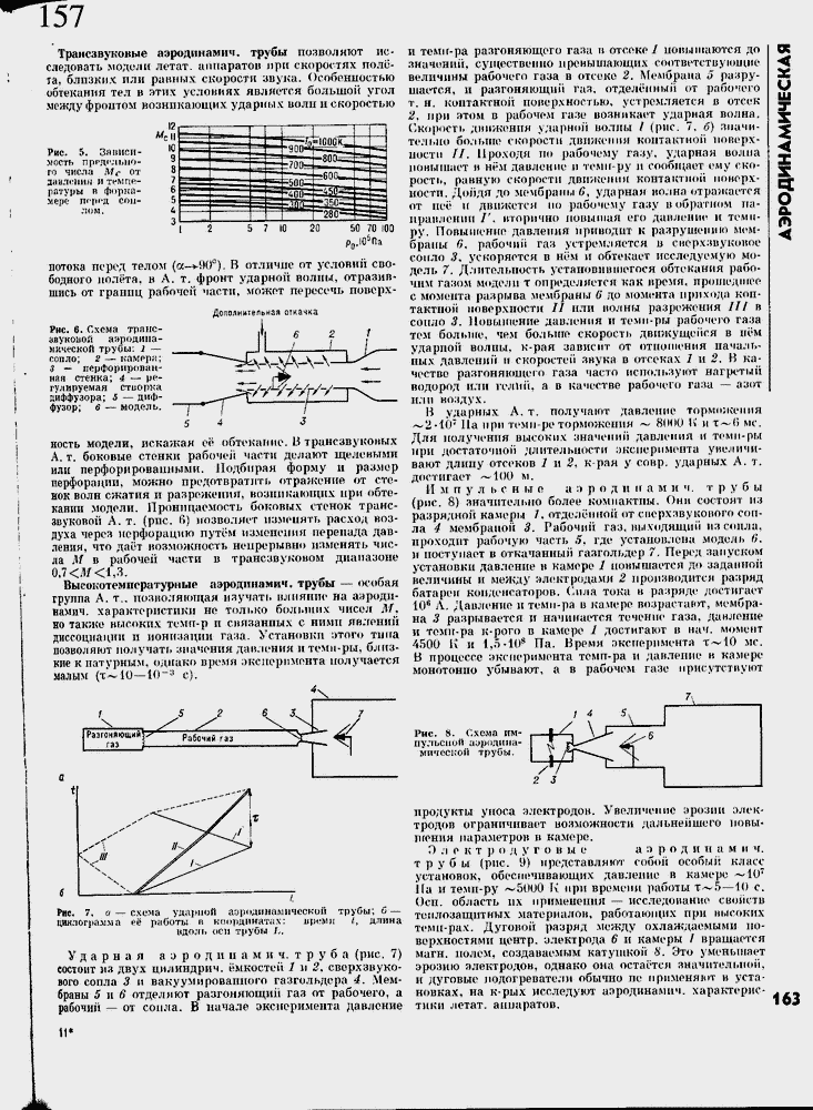 Ударная а э р о д и н а м и ч. т р у б а (рис. 7) состоит из двух цшшндрич. ╦мкостей 1 и 2, сверх ав у нового сопла 3 и вакуумированного газгольдера 4, Мембраны 5 и в отделяют разгоняющий газ от рабочего, а рабочий ≈ от сопла. В начале эксперимента давление