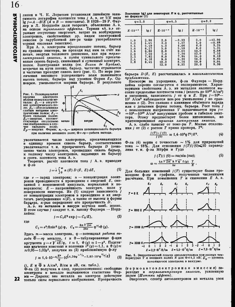 (j, Е и Ф в А/см3, В/см и эВ, см. табл.). Ф-ла (2) получена в след, предположениях: свободные электроны в металле подчиняются статистике Ферми ≈ Дирака; вне металла на электрон действуют только силы зеркального изображения. Прозрачность