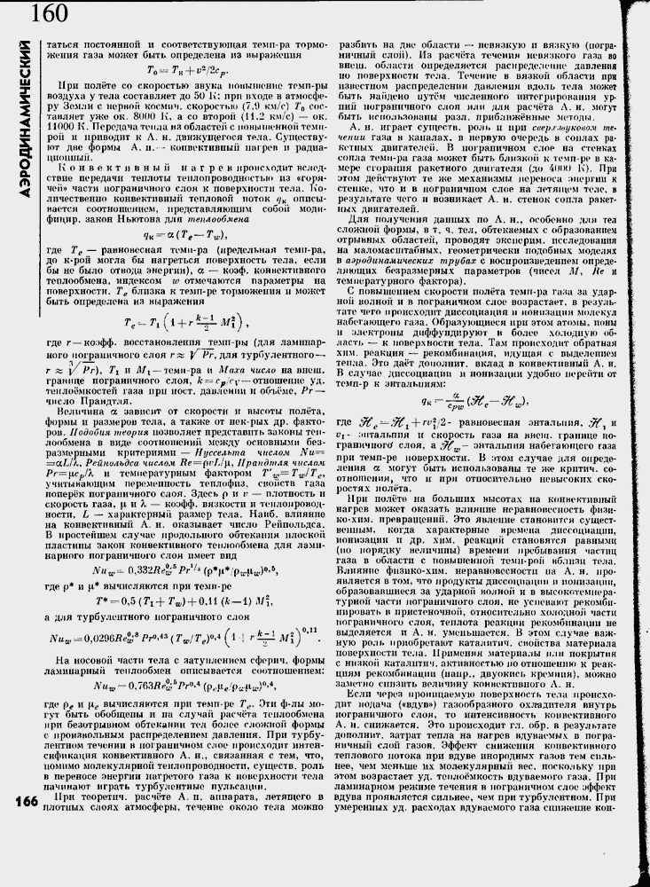 Величина а зависит от скорости к высоты пол╦та, формы и размеров тела, а также от нек-рых др. факторов. Подобия теория позволяет представить законы теплообмена в виде соотношений между основными безразмерными критериями ≈ Нуссельта числом Nu= = aL/Jl. Рейнолъдса числом Лр = р1?/,/|Л, Лрандтля числом Рг=\\Мр/К и температурным фактором T'^,= Tw/Tei учитывающим переменность теплофиз. свойств гаяа попер╦к пограничного слоя. Здесь риг ≈ плотность п скорость газа, \i и А, ≈ коафф. вязкости и теплонронод-ности, L ≈ характерный размер тела. Наиб, влияние на конвективный А. н. оказывает число Рейпольдса, В простейшем случае продольного обтекания плоской пластины закон конвективного теплообмена для ламинарного пограничного слоя имеет вид