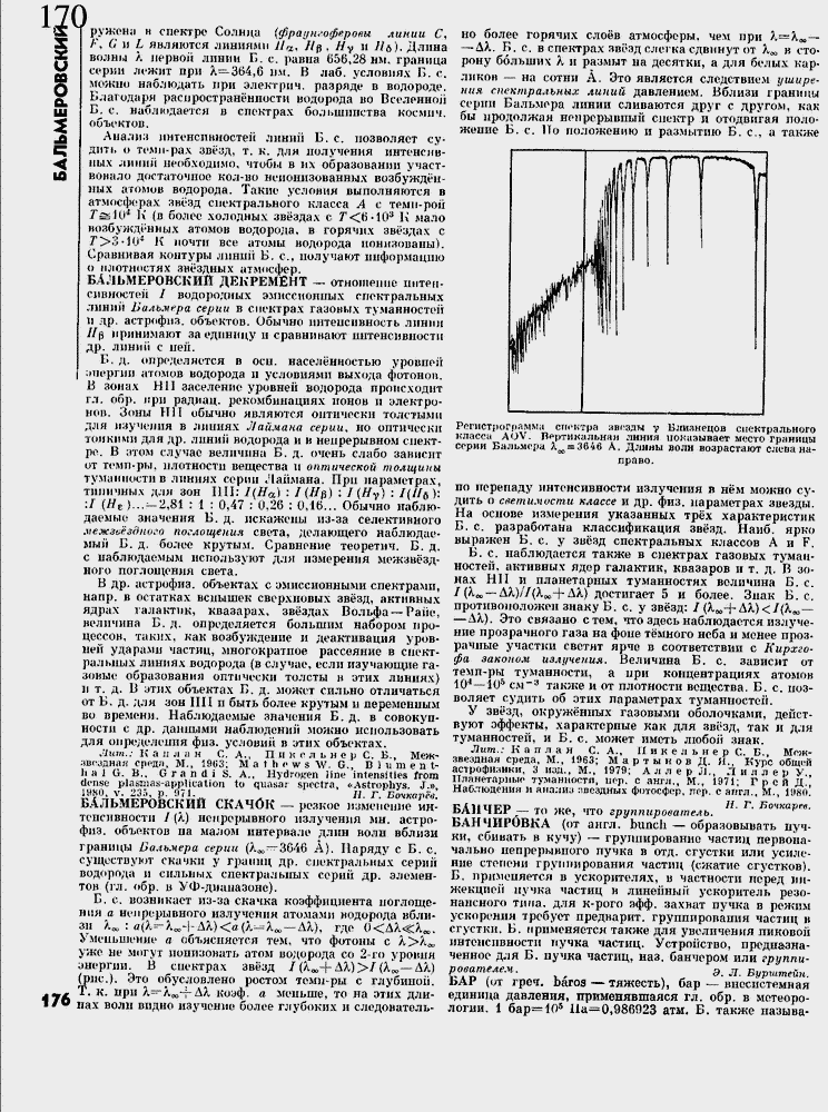 Лит.; К а и л п н С, А., П и к t1 л ь н с р С. Б., Меж-явгадная сред?!, М., Ш>3; М a t b с w s W. G.t В 1 u т е n t-h a i <j. В., G r a n d i S. A,, Hydrogen lint; intensities from dense plasmas-application to quasar spectra, «Astrophys, J.>>T 19SO, v. 235, p. 971. П. Г. Вочкар╦в. БАЛЬМЕРОВСКИЙ СКАЧОК -^ резкое изменение интенсивности / (л) непрерывного излучения мн. астро-фнз. объектов па малом интервале длин волн вблизи