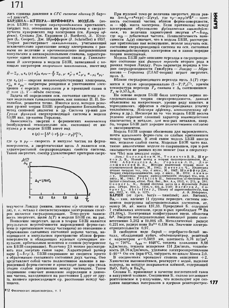 БАРДИНА≈КУПЕРА≈ШРЙФФЕРА МОДЕЛЬ (модель LJK1II) ≈ теория сверхпроводимости кристалл ич, тв╦рдых тол, основанная на представлении о сверхтекучести куперовских пар электронов (см. Купера эффект]. Создана Дж. Вардином (J. Bardoen), Л. Купером {L. Cooper), Дж. Шриффером (J , Schriei'fer) в 1957. Теория рассматривает гамильтониан, учитывающий исключительно притяжение между электронами с равными ко величине и противоположно направленными импульсами и антипараллельными спинами, характеризуемое одной положит, константой связи g. Гамильтониан // электронов и модели БКШ, записанный с помощью операторов вторичного квантования, имеет вид