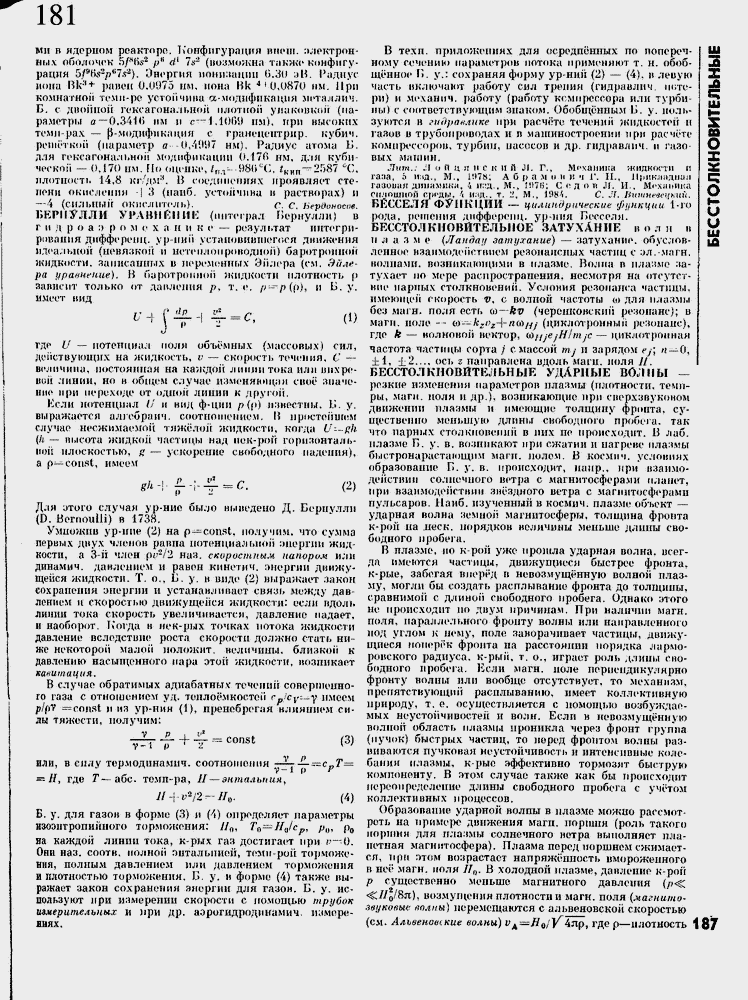 на каждой линии тока, к-рых газ достигает при ?;--(). Они наз. соотв. полной энтальпией, тс'мп-poii; торможения, полным давлением или давленном торможения н плотностью торможения. Б. у. н форме (4) также иы-ражает закон сохранения энергии для газов. Б, у. используют при измерении скорости с помощью трубок измерительных и лри др. аорогидродннамич. измерениях.