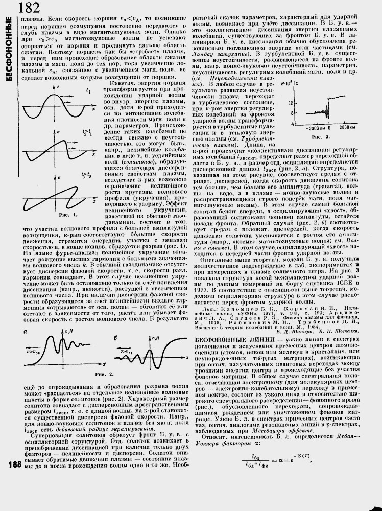 Суперпозиция солитопов образует фронт Б, у. в. с осцилляторной структурой. Отд. солитон возникает в пренебрежении диссипацией при наличии только длух факторов ≈ нелинейности и дисперсии. Солитон описывает обратимые движения плазмы ≈ состоянии плазмы до и поело прохождения волны одно и то же. Нсоб-