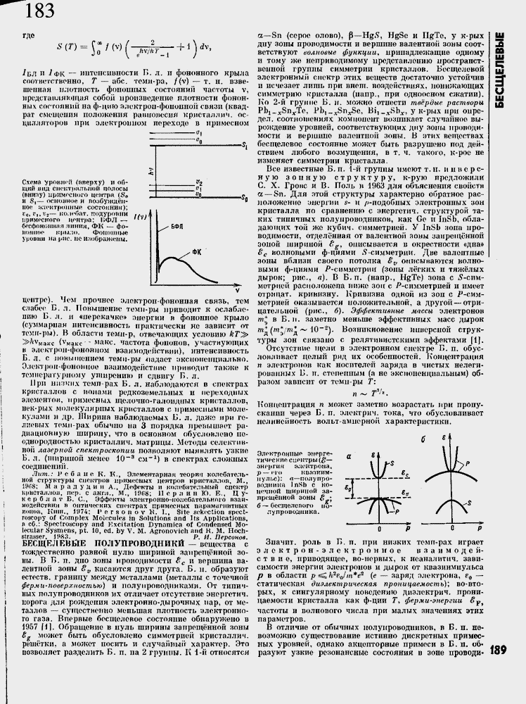 Лит.: Р е и а н « К. К., Элементарна» теории колебательной структуры спектров примесных центров кристаллов, М., 19(38: М а р а л у д и и А., Дефекты и колебательный спектр кристалл он, ш:р. с англ., М., 1Ш!8; II е р л и н Ю, Е., Ц у-нерблат Б. С,., Эффекты «лектронно-ко^ебательнпго пзаи-мо действ ил в оптических спектрах примесных парамагнитных иошш, Ниш., 1974; Р era on о v К. I,, Site sekection spect-roscopy of Complex Molecules in Solutions and Its Applications, n сб.: Spectroscupy and Excitation Dynamlca of Condensed Molecular Sysmens, pt. 10, ed. by V. M. Agronovich and И. М, Hoch-strasser, JH83. P. И. Персиков. БЕСЩЕЛЕВЫЕ ПОЛУПРОВОДНИКИ ≈ вещества с тождественно равной нулю шириной запрещенной зоны. В Б. п. дно зоны проводимости #с и вершина валентной зоны Sv касаются друг друга. Б. п. образуют естеств. границу между металлами {металлы с точечной ферм-и-поверхностью) и полупроводниками. От типичных полупроводников их отличает отсутствие аноргстич. порога для рождения электронно-дырочных пар, от металлов ≈ существенно меньшая плотность электронного газа. Впервые босщслевоо состояние обнаружено в 1957 Ml. Обращение в нуль ширины запрещ╦нной зоны £g может быть обусловлено симметрией кристаллич. реш╦тки, а может носить и случайный характер. Это позволяет разделить Б, п. на 2 группы. К 1-й относятся