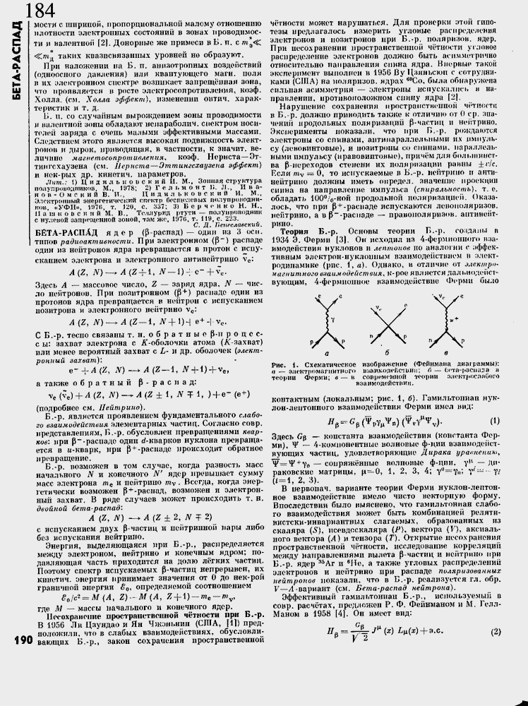 В иервонач. варианте теории Ферми нуклон-лептон-ное взаимодействие имело чисто векторную форму. Впоследствии было выяснено, что гамильтониан слабого взаимодействия может быть комбинацией релятивистски-инвариантных слагаемых, образованных из скаляра (S), нсевдоскаляра (jP), вектора (V), аксиального вектора (А] и тензора (Т], Открытие несохранения пространственной ч╦тности, исследование корреляции между направлениями вылета р-частиц и нейтрино при Б.-р. ядер 35Аг и вНе, а также угловых, распределений электронов и нейтрино при распаде поляризованных нейтронов покапали, что в Б.-р. реализуется гл. обр. V≈Л-вариант (см. Бета-распад нейтрона].