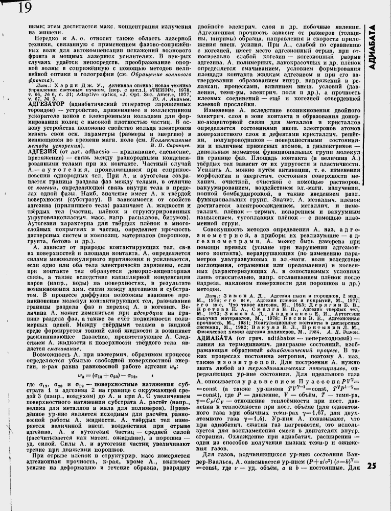 АДГЕЗАТОР (адиабатический генератор заряженных тороидов) ≈ устройство, применяемое в коллективном ускорителе ионов с электронными кольцами для формирования колец с высокой плотностью частиц. В основу устройства положено свойство кольца электронов менять свои осн. параметры (размеры и энергию) в меняющемся во времени магн. ноле (см. Коллективные методы ускорения). Я. Я. Счраицев. АДГЕЗИЯ (от лат. adhacsio ≈ прилипание, сцепление, притяжение) ≈ связь между разнородными конденсированными телами при их контакте. Частный случай А.-- а у т о г е з и я, проявляющаяся при соприкосновении однородных тел. При А. и аутогезии сохраняется граница раздела фаз между телами, в отличие от когезии, определяющей связь внутри тела в пределах одной фазы. Наиб, значение имеет А. к тв╦рдой поверхности (субстрату), В зависимости от свойств адгезива {прилипшего тела) различают А. жидкости и тв╦рдых тел (частиц, пленок и структурированных улруговязкопластич. масс, напр. расплавов, битумов). Аутогезия характерна для тв╦рдых пл╦нок в многослойных покрытиях и частиц, определяет прочность дисперсных систем и композиц. материалов (порошков, груптат бетона и др.).