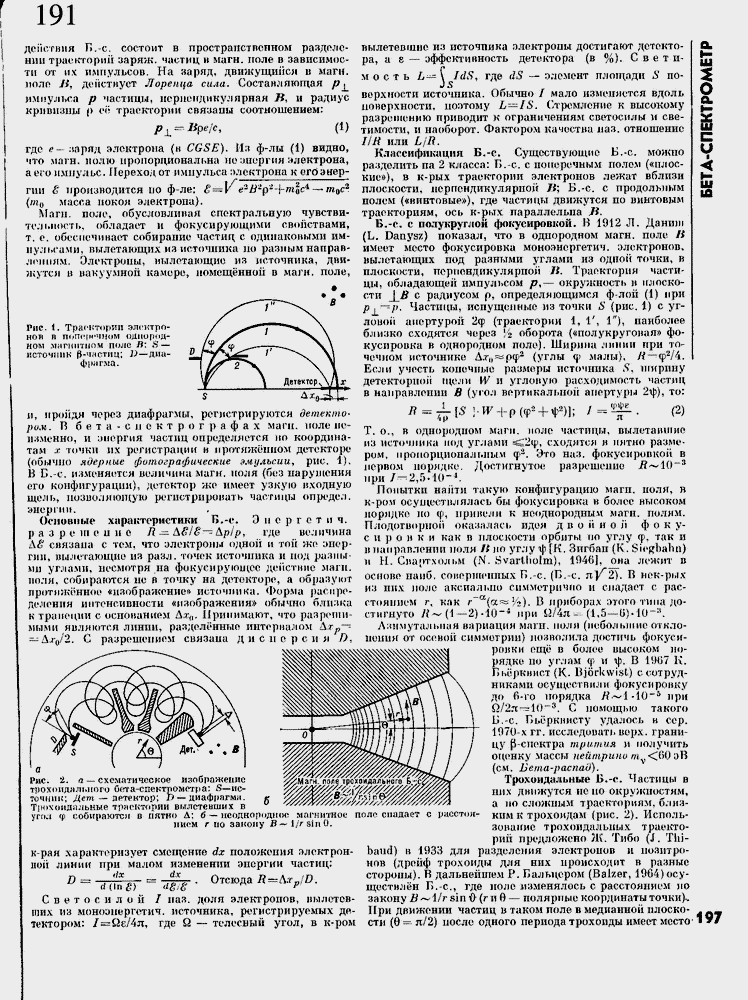 Б.-с. с полукруглой фокусировкой. Б 1912 Л. Даншл (L. Danysz) показал, что в однородном магн. поле К имеет место фокусировка мокоэнергетич, электронов, вылетающих под разными углами из одно» точки, в плоскости, перпендикулярной Л. Траектория частицы, обладающей импульсом р,≈ окружность в плоскости _\\_В с радиусом р, определяющимся ф-лой (1) при р , ~^р. Частицы, испущенные из точки S (рис, 1) с угловой апертурой 2ф (траектории 1, 1', 1"), наиболее близко сходятся через 1/2 оборота («полукруговая» фокусировка в однородном поле). Ширина линии при точечном источнике Ах,)«рф2 (углы (р малы), Н ≈ф2/4. Если учесть конечные размеры источника S, ширину детекторной щели W и угловую расходимость частиц в направлении В (угол вертикальной апертуры 2г|э), то: