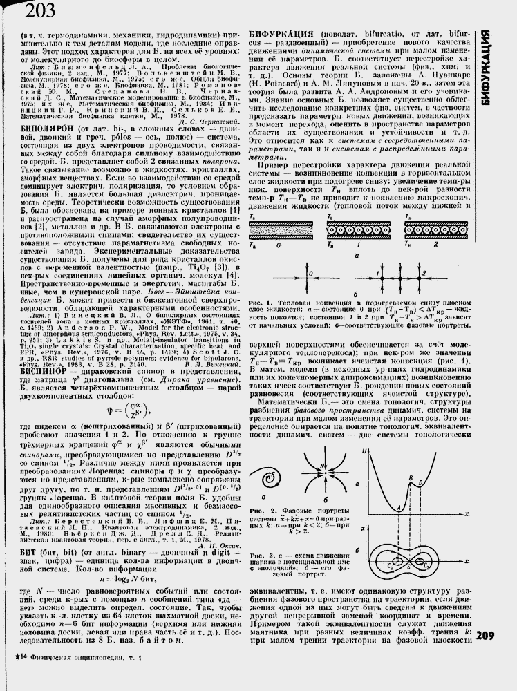 БИФУРКАЦИЯ (поводит, bifurcalio, от лат. bifnr-cua ≈ рвздвоешшп) ≈ приобретение нового качества движениями динамической системы при малом изменении е╦ параметров. Т1. соответствует перестройке характера движения реальной системы (физ., хим; и т. д.). Осноны теории Ij. заложены Л. llyairxapc (Н. Poincare) и А. М . Лятгуноным в нач. 20 н., ;*атем ута теории была развита А, А. Андроповым и его учениками. Знание основных Б. позволяет сущестиенно облегчить исследование конкретных физ. систем, в частности предсказать параметры новых движении, возникаюлцтх л момент перехода, оценить в пространстве параметров области их существования н устойчивости и т. д. Это относится как к системам с сосредоточенными параметрами, так и к системам с распредел╦нными параметрами.