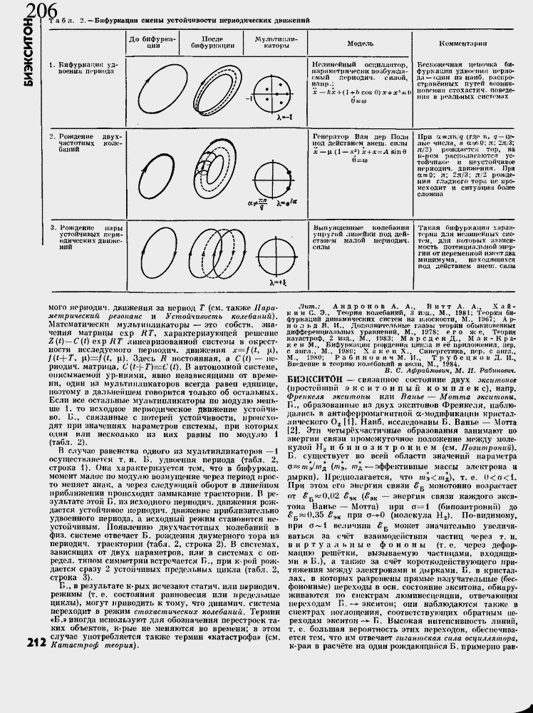 В с.чучао равенства одного из мультипликаторов ≈1 осуществляется т. н. Б. удвоения периода (табл. 2, строка 1). Она характеризуется тем, что в бифуркац. момонт малое по модулю возмущение чврез период просто меняет знак, а череа следующий оборот в линейном приближении происходит замыкание траектории. В результате ;)той Б. ии исходного периодич, движения рождается устойчивое периодич. движение приблизительно удвоенного периода, а исходный режим становится неустойчивым. Появлению днухчастотпых колебаний в физ. системе отвечает Б. рождения двумерного тора из периодич. траектории (табл. 2, строка 2). В системах, зависящих от двух параметров, или в системах с ой-родел. типом симметрии встречается Б., при к-рой рождается сразу 2 устойчивых предельных цикла (табл. 2, строка 3).