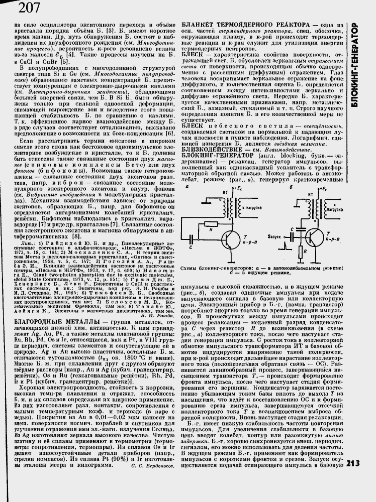 БЛЕСК п е б.е с ного светила ≈ освещ╦нность, создаваемая свотилом па нормальной к падающим лучам плоскости в пункте наблюдения. Логарифмич. единицей измерения Б, является зв╦здная величина. БЛИЗКОД╗ЙСТВИЕ ≈ см. Взаимодействие. БЛОКИНГ-ГЕНЕРАТОР (англ, blocking, букв.≈ задерживание) ≈ релаксац. генератор импульсов, выполненный как однокаскадный усилитель с трансформаторной обратной связью. Может работать в автоко-лебат, режиме (рис., и), генерируя кратковременные