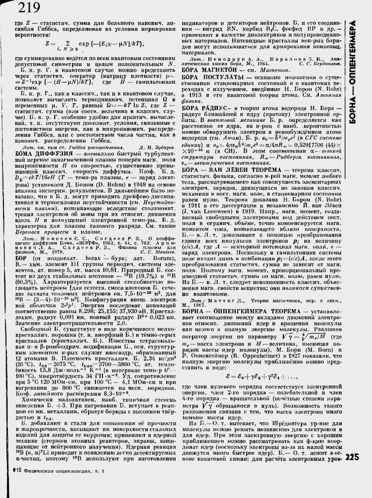 Лит. см. при ст. Гиббса распределения. Д. Н. Зубарев. БОМЛ ДИФФУЗИЯ ≈ аномально быстрый турбулентный перенос намагниченной плазмы попер╦к магн. поля напряж╦нности II со скоростью, существенно превышающей классич. скорость диффузии. Коэф. Б. д. D~≈cfrT/lfieFf (Т ≈ темп-pa плазмы, е ≈ заряд элект-