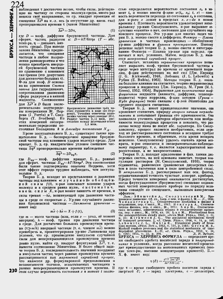 стью определяется вероятностью состояния #0 в момент £(( и можно цвести ф-цию и>(£0, д-└; /, а:} ≈ плотность вероятности перехода из состояния .г0 в состояние, для к-рого .т лежит в пределах х. x-\\-dx в монет времени t. Плотность вероятности удовлетворяет интегральному ур-нию Смолуховского, к-рое выражает отсутствие «памяти» о нач. состоянии для случайного марковского процесса. Это ур-ние для многих задач теп» рии Б. д. можно свести к дифферонц. Фоккера ≈ Планы уравнению в частных производных ≈ обобщ╦нному ур-нию диффузии в фазовом пространстве. Поэтому решение задач теории Б. д. можно свести к интегрированию Фоккера ≈ Планка ур-лия при оиредел. граничных и нач. условиях. Матом, моделью Б. д. является вииероаский случайный процесс.