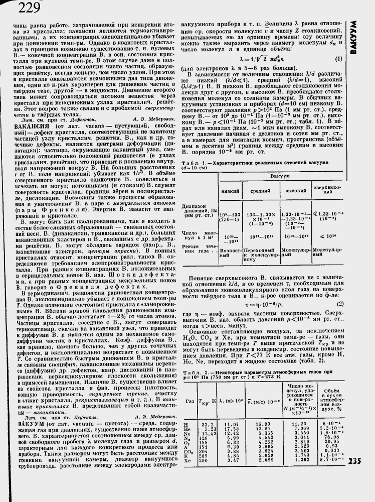 В зависимости от величины отношения K!d различают низкий (\\!d -С 1), средний (kid ^ 1), высокий (kid^>\\} В. В низком В. преобладают столкновения молекул друг с другом, в высоком В. преобладают столкновения молекул со стенками камеры. В обычных вакуумных установках и приборах (d≈10 см) низкому В. соответствуют давления р>10а Па (1 мм рт. ст.), среднему В.≈ от W до 1Q-1 Па (1≈10~а мм рт. ст.), высокому В.≈ р<10-1 Па (10~3 мм рт. ст.; табл. 1). В порах или каналах диам. "-1 мкм высокому В. соответствует давление начиная с десятков и сотен мм рт, ст., а в камерах для имитации космич. пространства (объ╦мом в десятки м3) граница между средним и высоким В. порядка 10~6 мм рт. ст.