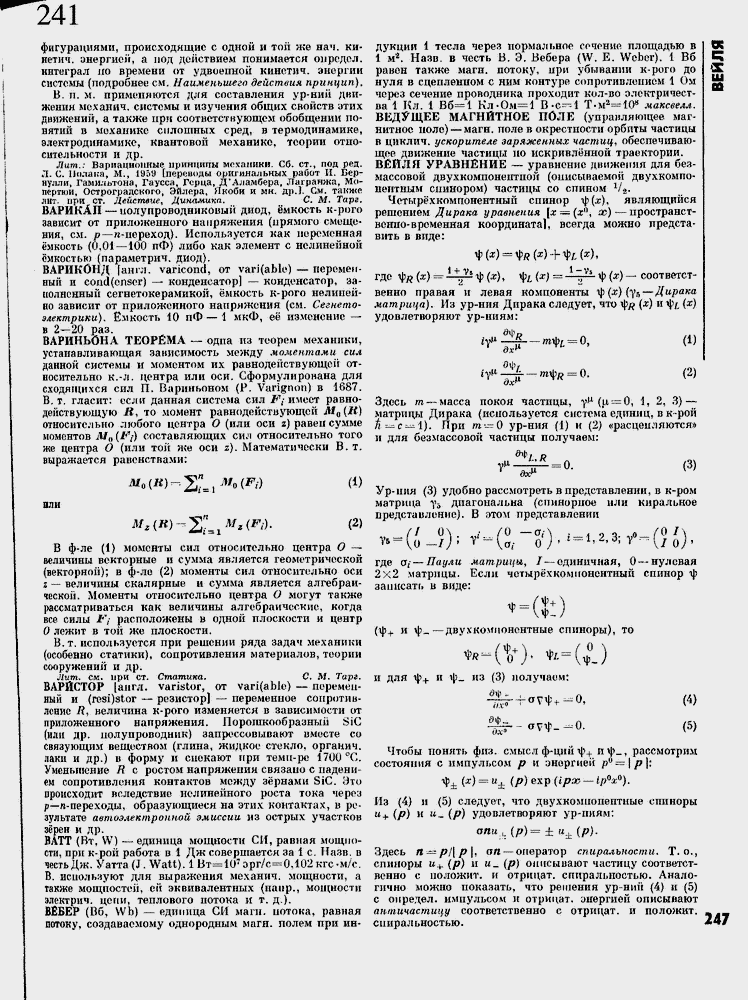 дукции 1 тесла через нормальное сочоние площадью в 1 м2. Назв. в честь В, Э. Бебера (W. E. Weber). 1 Вб равен также магн. потоку, при убывании к-рого до нуля в сцепленном с ним контуре сопротивлением 1 Ом через сечение проводника проходит кол-во электричества 1 Кл. 1 Вб≈ 1 Кл -0*1=1 В-С≈ 1 Т-м2≈ 1Q8 максвелл. ВЕДУЩЕЕ МАГНИТНОЕ ПОЛЕ (управляющее магнитное поле) ≈ магн. поле в окрестности орбиты частицы в циклич. ускорителе заряженных частиц, обеспечивающее движение частицы но искривл╦нной траектории. В£ЙЛЯ УРАВНЕНИЕ ∙≈ уравнение движения для безмассовой двух компонентно и (описываемой двухкомпо-нвптным спинором) частицы со спином 1/2.
