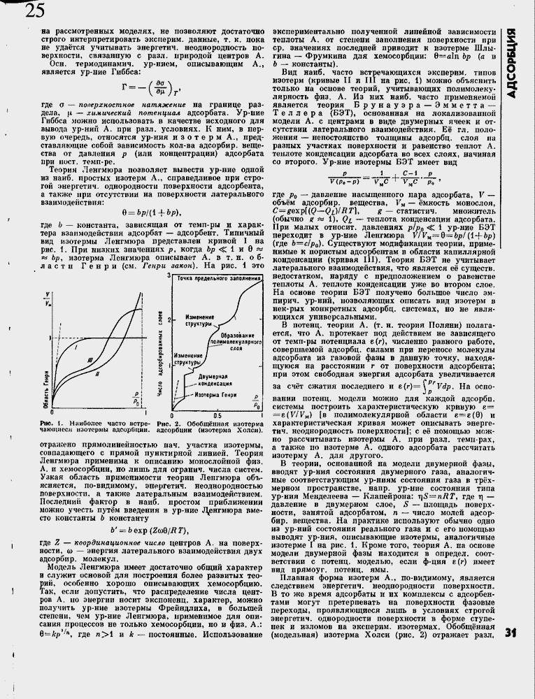 на рассмотренных моделях, не позволяют достаточно строго интерпретировать эксперим. данные, т, к. пока не уда╦тся учитывать энергетич. неоднородность поверхности, связанную с разл. природой центров А. Осн. термодинамич. ур-нием, описывающим А., является ур-ние Гиббса: