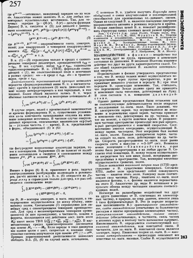 Однако данные представления были оставлены как не соответствующие действительности после открытия и исследования эл.-магн. поля. Было доказано, что В. электрически зарнж. тел осуществляется не мгновенно и перемещение одной заряж. частицы приводит к изменению сил, действующих на др. частицы, не и тот же момент, а спустя конечное время. В разделяющем частицы пространстве происходит нек-рый процесс, K-puii распространяется с конечной скоростью. Соответственно имеется «посредник», осуществляющий В, между заряж. частицами. Этот посредник был назван эл.-магн. полем. Каждая электрически заряж. частица создает эл.-магн. ]юле, действующее на др. частицы. Скорость распространения эл.-магн. поля равна скорости света в вакууме с «З-Ю10 см/с. Возникла новая концепция ≈ 6 л и з к о д е и с т в и я, к-рая позже была распространена и на любые другие В. Согласно этой концепции, В, между телами осуществляется посредством тех или иных полей, непрерывно распредел╦нных в пространстве. Так, всемирное тяготение осущесталяетсн гравитац. полем.