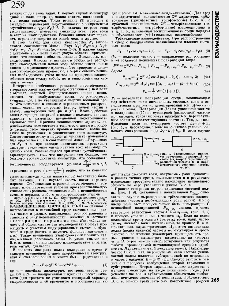 Лит.: Кадомцев Б. В., Коллективные ЯПДРНИЯ в плазме, М., 1975; А р н и м о и и ч Л. А,, С а г д с с u P. 3-, Фшина пла'.чмы для физиков, М., J979. В. Н. Оранский. ВЗАИМОДЕЙСТВИЕ СВЕТОВЙХ ВОЛИ ≈ связало с энергообмсном в нелинейной среде световых волн разных частот и разных направлений распространения и приводит к ряду нелинейнооптич. явлений, в частности к г е н е р а ц и н гармоник (см. Нелинейная оптика]. В общем случае эти взаимодействия могут происходить с участием индуцированных светом возбуждений в среде (оитич. и акустпч. фопонов, магнонов и т, п.). Такие нелинейные взаимодействия принято наз. тиуждеииым. рассеянием света. В узком смысле под В, с. в. понимают нелинейное взаимодействие эл.-магн. волн оптич. диапазона.