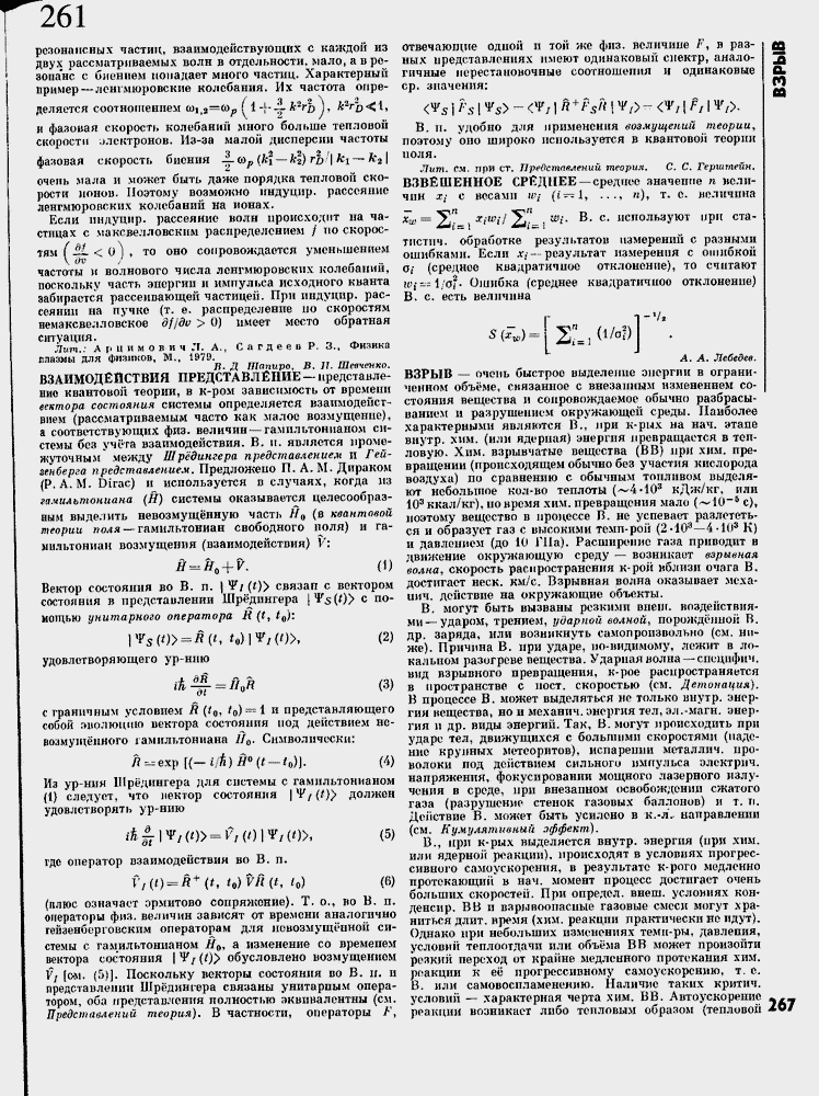 ВЗАИМОДЕЙСТВИЯ ПРЕДСТАВЛЕНИЕ ≈ представление квантовой теории, в к-ром зависимость от времени вектора состояния системы определяется взаимодействием (рассматриваемым часто как малое возмущение), а соответствующих физ. величин ≈ гамильтонианом системы без учета взаимодействия. В. п. является промежуточным между Шр╦дингера представлением и Гей-зенбереа представлением. Предложено П. А, М. Дираком {Р. А. М. Dirac) и используется в случаях, когда из