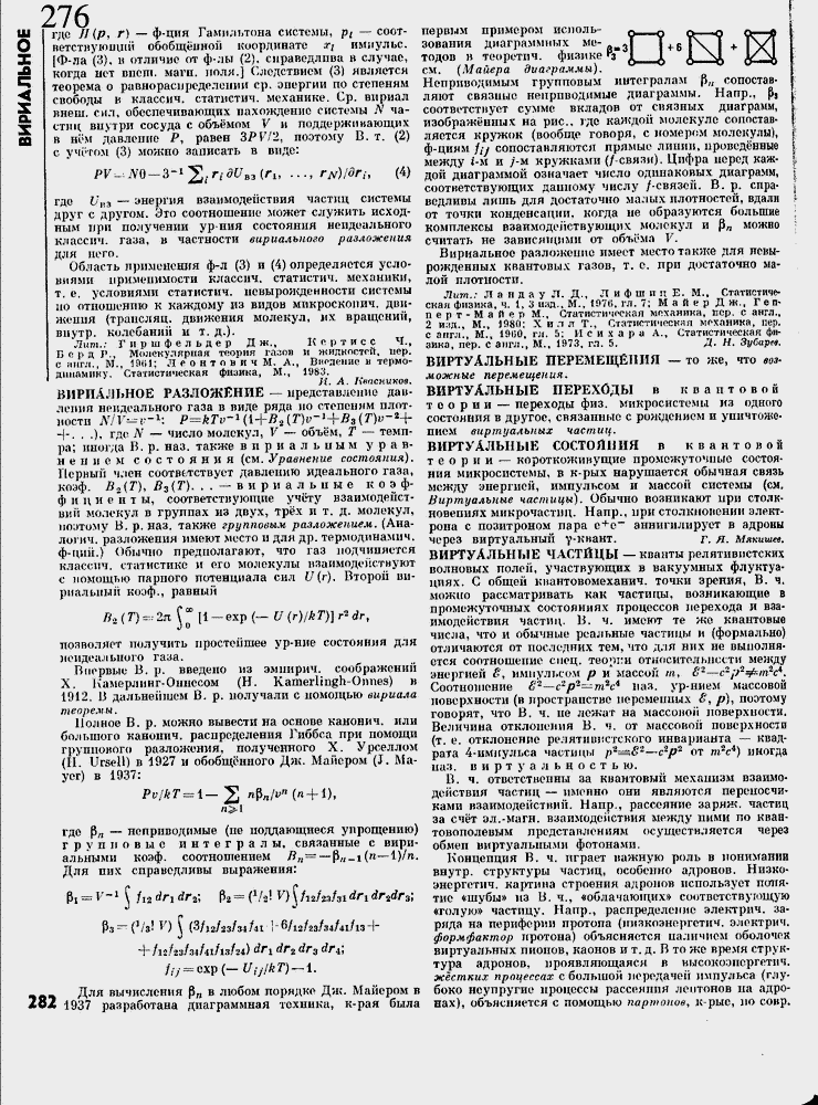 БИРИАЛЬНОЕ РАЗЛОЖЕНИЕ ≈ представление дан-лепил неидеального газа в пвде ряда но степеням плотности NJV^v-1'. P=kTv~i(i+Bt(T)v-1+B3(T)v-*+ -К . .)∙ где Л' ≈ число молекул, V ≈ объ╦м, Т ≈ темп-pa; иногда В. р. ваз. также в и р и а л ь н ы м уравнением состояния (см. Уравнение состояния). Первый член соответствует давлению идеального газа, коэф. Д2(7')> ^3(7')1 . . ≈ в и р и а л ь н ы е к о э ф-ф и ц и Р и т ыт соответствующие учету взаимодействий молекул в группах из двух, тр╦х и т. д. молекул, поэтому В, р. наз, также групповым разложением. (Ана-логмч. разложения имеют место и для др. термодмнамич, ф-цип.) Обычно предполагают, что газ подчиняется классич. статистике и его молекулы взаимодействуют с помощью парного потенциала сил (7 (г). Второй ви-риальпый коэф,, равный