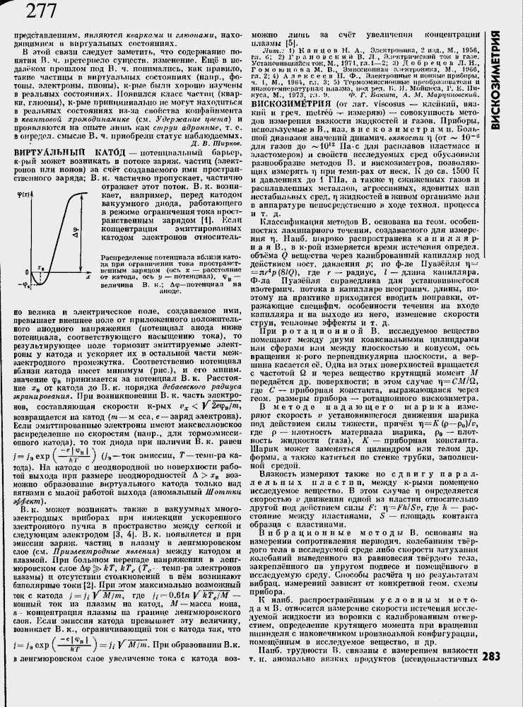 Классификация методов В. основана на геом. особен* ностях ламинарного течения, создаваемого для измерения т). Наиб, широко распространена к а п и л д я р-н а я В., в к-рой измеряется время истечения определ. объ╦ма Q вещс-ства чирез калибронанЕгьш капилляр иод действием пост, давления /?; до ф-ле Пуаз╦йля i] ≈ ≈nr^pfilQ), где г ≈ радиус, / ≈ длила капилляра. Ф-ла Пуаз╦шш справедлива для установившегося изотермич, потока в капилляре неограпич. длины, поэтому па практике приходится вводить поправки, отражающие сноцифич. особенности течения на входе капилляра и па выходе из него, изменение скорости струи, тепловые эффекты и т. д.