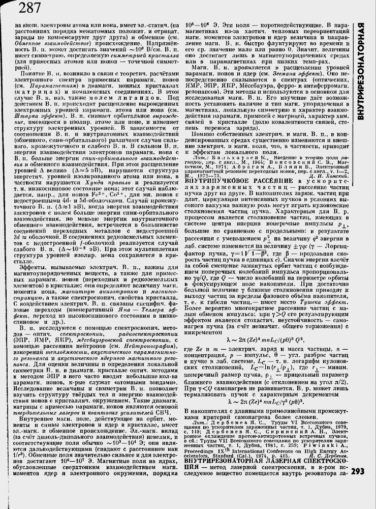 Лит.: Б а .м г. х а у ,ч е н К., Введение и теорию поля ли-гандои, пер. с англ., М., 1ШН; В о н с о в с к и и С. В., Маг-н(!ти:?м, .М., 1У71; А б р а г а м А., Б лини Б., Электронный парамагнитный резонанс переходных ионов, пер. с англ., т. 1 ≈ 2, М., 1972≈73. Д. И. Хамский. Ш1УТРИПУЧКОВОЕ РАССЕЯНИЕ в ускорителях заряженных частиц ≈ рассеяние частиц пучка друг па друге. В накопителях заря/к, частиц при длит, циркуляции интенсивных пучков п условиях высокого вакуума важную роль могут играть кулоновские столкновения частиц пучка. Характерным для В. р. процессом является столкновение частиц, имеющих в системе центра инерции поперечные импульсы р.