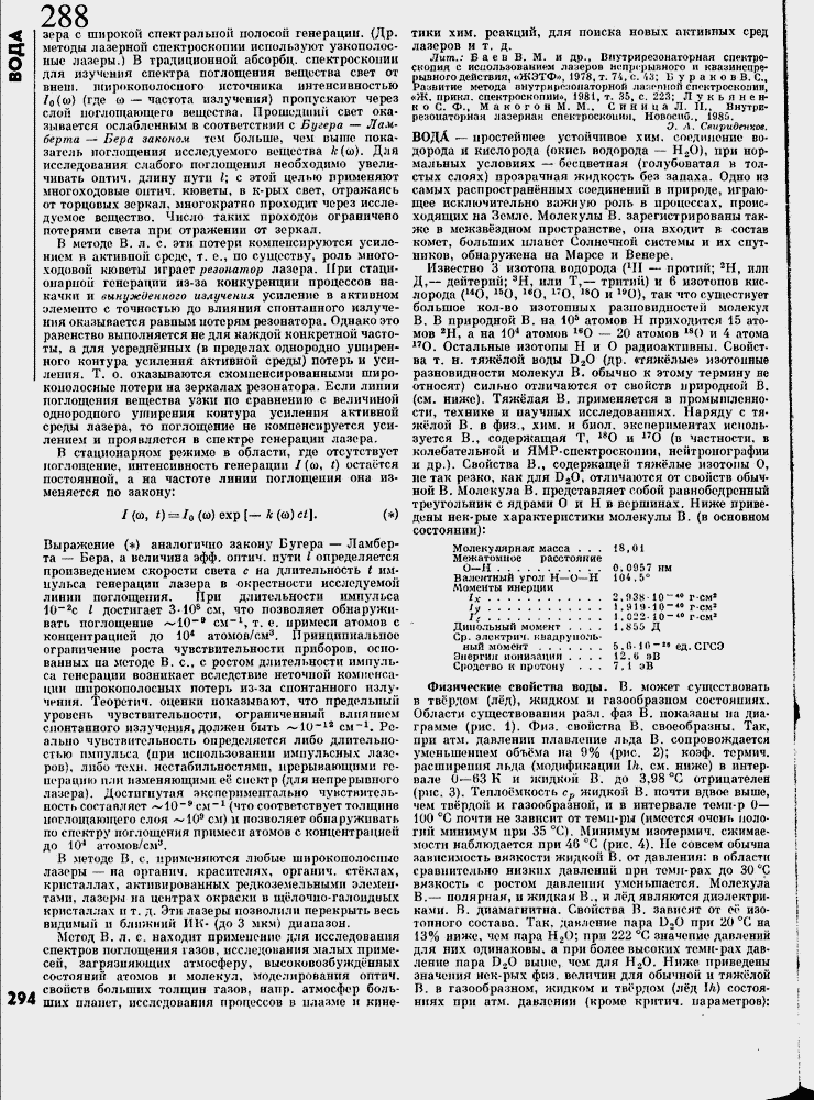 Физические свойства воды. В. может существовать в тв╦рдом (лед), жидком и газообразном состояниях. Области существования раал. фаз В. показаны на диаграмме (рис. 1). Фнз. свойства В. своеобразны. Так, при атм. давлении плавление льда В. сопровождается уменьшением объема на 9% (рис. 2); коэф. тормич. расширения льда (модификации Ik, см. ниже) в интерпале О≈НЗ К и жидкой В. до 3,98 °С отрицателен (рис. 3), Тепло╦мкость ср жидкой В. почти вдвое выше, чем тв╦рдой к газообразной, и в интервале томп-р О≈ 100 °С почти не зависит от темп-ры (имеется очень пологий минимум при 35 °С). Минимум изотермич. сжимаемости наблюдается при 46 °С (рис. 4). Не совсем обычпа зависимость вязкости жидкой В. от давления: в области сравнительно низких давлений при томн-рах до 30 °С вязкость с ростом давления уменьшается. Молекула В.≈ полярная", и жидкая В., и л╦д являются диэлектриками. В. диамагнитна. Свойства В. зависят от е╦ изотопного состава. Так, давление пара D20 при 20 °С на 13% ниже, чем пара Н2О; при 222 °С значопио давлений для них одинаковы, а при более высоких теми-pax давление пара D20 выше, чем для Н20. Ниже приведены значения нек-рьтх физ. величин для обычной и тяж╦лой В. в газообразном, жидком и твердом (л╦д Ik) состояниях при атм. давлении {кроме критич. параметров):