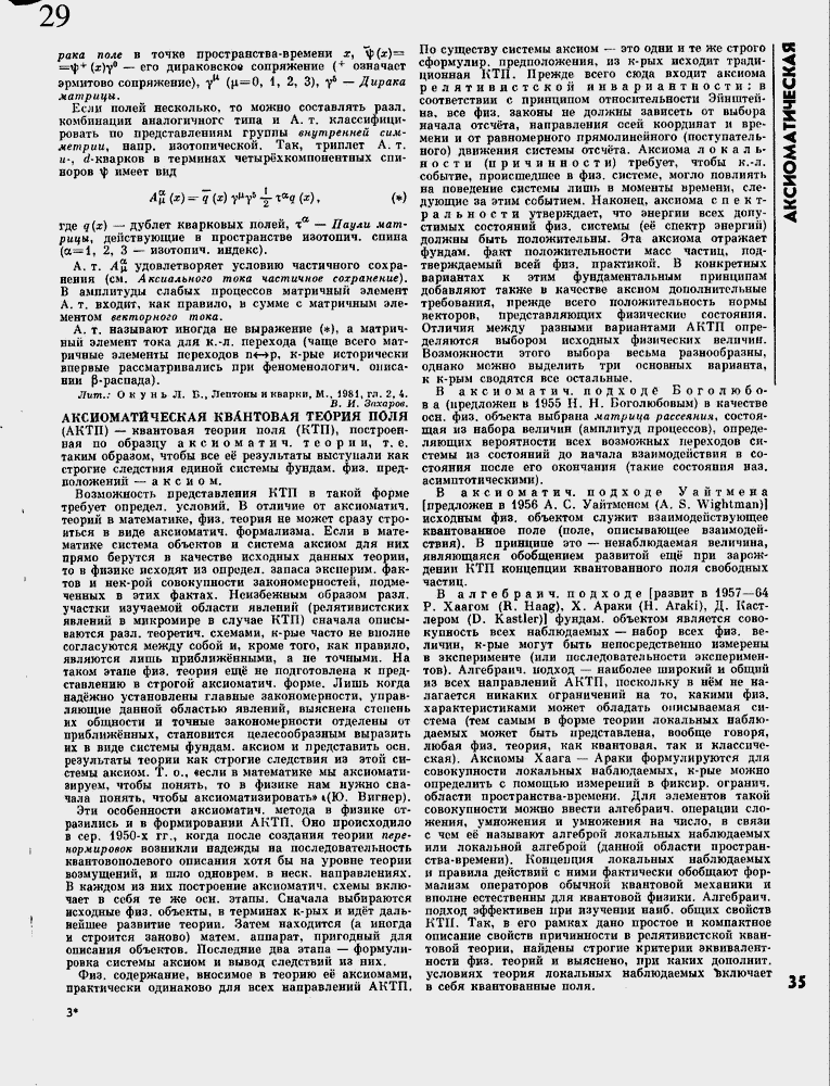 По существу системы аксиом ≈ это одни и те Же строго сформулир, предположения, из к-рых исходит традиционная КТП. Прежде всего сюда входит аксиома релятивистской инвариантности: в соответствии с принципом относительности Эйнштейна, все физ. законы не должны зависеть от выбора начала отсч╦та, направления осей координат и времени и от равномерного прямолинейного (поступательного) движения системы отсч╦та. Аксиома локальности (причинности) требует, чтобы к.-л, событие, происшедшее в физ. системе, могло повлиять на поведение системы лишь в моменты времени, следующие за этим событием. Наконец, аксиома спектральности утверждает, что энергии всех допустимых состояний физ. системы (е╦ спектр энергий) должны быть положительны. Эта аксиома отражает фундам. факт положительности масс частиц* подтверждаемый всей физ. практикой. В конкретных вариантах к этим фундаментальным принципам добавляют также в качестве аксиом дополнительные требования, прежде всего положительность нормы векторов, представляющих физические состояния. Отличия между разными вариантами АКТП определяются выбором исходных физических величин. Возможности этого выбора весьма разнообразны, однако можно выделить три основных варианта, к к-рым сводятся все остальные,