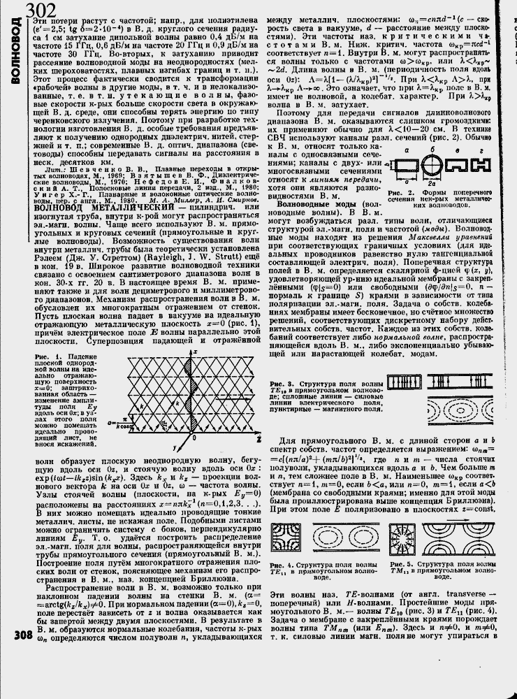 ≈ с[(пп/а)2-\\- (тея/&)2]1/Ч где пит ≈ числа стоячих полуволн, укладывающихся вдоль а и Ь, Чем больше т и л, тем сложнее поле в В. м. Наименьшее юкр соответ-ствует »=1, от≈0, если Ь<а, или /г=0, т=1» если а<& (мембрана со свободными краями; именно для этой моды была проиллюстрирована выше концепция Бриллюэна). При этом поле Е поляризовано в плоскостях z=const.