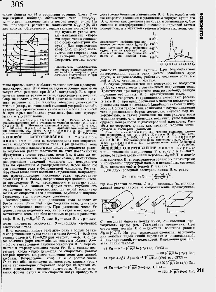 Лит.: Сретенский Л. Н., Теория волновых движений жидкости, 2 изд., М"., 1977; Ко чин Н. Е., Собр. соч., т. 1≈2, М.≈ Л., 194Я; А п у х т и и II. А., В о и т к у и-с к и И Я. И., Сопротивление РОДЫ движению судов, М.≈ Л., 1953; П а в л с н н о Г. Е,, Сопротивление воды движению судов, М., 1ПГ>Ц. С. С. Войт, ВОЛНОВОЕ СОПРОТИВЛЕНИЕ линии перед а-чи ≈ отношение напряжения V к току I в эл.-магн. волне, бегущей вдоль линии передачи, Z =У/7; в линейных системах В. с. определяется только их параметрами и поперечной структурой полей, в нелинейных системах В. с, является ещ╦ м ф-цией V и (или) /.