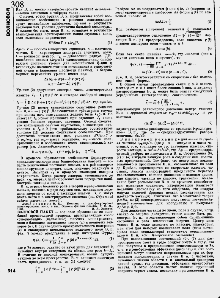 Лит.: Захаров В. Е., Коллапс и само фок у сир они а ленгмюровских волн, в кн.: Основы физики планмы, т. 2, М.т 1984. В. Е. Захаров. ВОЛНОВОЙ ПАКЕТ ≈ волновое образование из колебаний произвольной природы, представляющее собой суперпозицию (наложение) плоских монохроматич. волн с близкими значениями частот (оз) в волновых векторов (ft). В случае одного пространственного измерения (х) и скалярного комплексного волнового поля В. п. г) можно представить в виде интеграла Фурье: