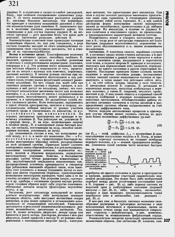 ным потоком}, что приостановит рост амплитуды. При этом в случае сильной дисперсии «выживает» практически лишь одна гармоника, и стационарное движение представляет собой почти гармонич. В., а при слабой дисперсии форма возмущения сильно варьируется вплоть до пилообразных, прямоугольных и др. наборов импульсов. Их амплитуда, в отличие от ударных В. или солитонов в «пассивных» средах, не произнольна, а предопределяется параметрами активной системы.
