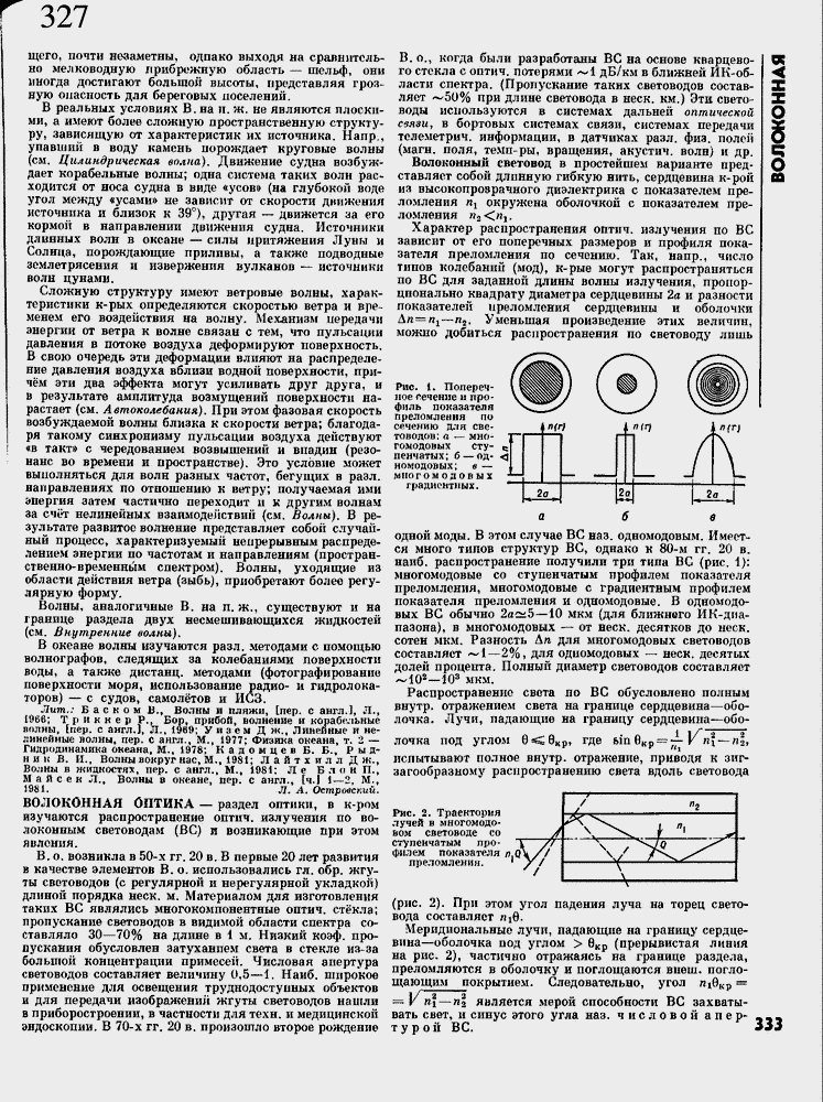 Характер распространения оптич. излучения по ВС зависит от его поперечных размеров и профиля показателя преломления по сечению. Так, напр., число типов колебании (мод), к-рые могут распространяться по ВС для заданной длины волны излучения, пропорционально квадрату диаметра сердцевины 2я и разности показателей преломления сердцевины и оболочки Д«≈«!≈л2. Уменьшая произведение этих величин, можно добиться распространения по световоду лишь