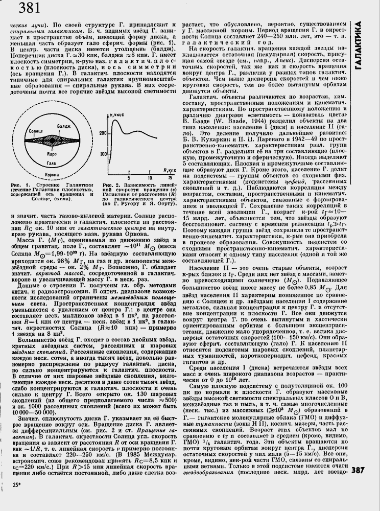 Значит, сплюснутость диска Г. указывает на е╦ быстрое вращение вокруг оси. Вращение диска Г. является дифференциальным (см. рис. 2 и ст. Вращение галактик). В галактич. окрестности Солнца угл. скорость вращения о) зависит от расстояния R от оси вращения Г. как ~1/Я, т. е. линейная скорость v примерно постоянна и составляет 220≈250 км/с. (В 1985 Междунар. астрономич. союз рекомендовал принять /?с≈8,5 кпк и tQ= 220 км/с.) При Л>15 кпк линейная скорость вращения либо оста╦тся постоянной, либо даже слегка воз-