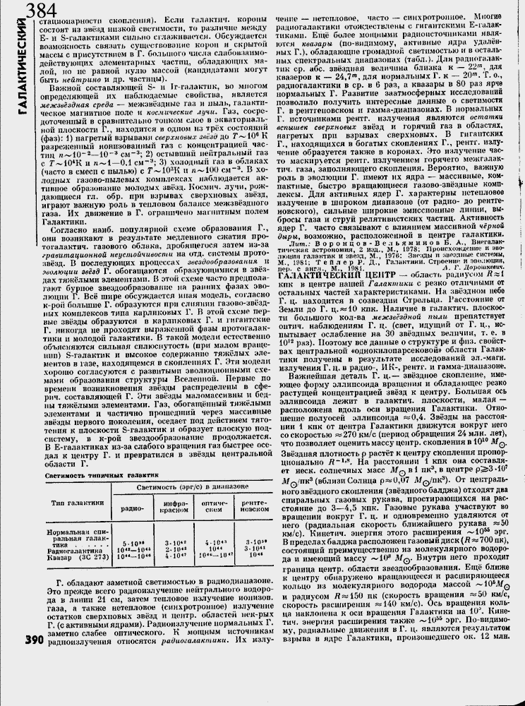 чение ≈ нетошюоое, часто ≈ синхротронное. Многие радиогалактики отождествлены с гигантскими Е-галак-тнками. Еще более мощными радионсточннкамн являются квазары, (по-видимому, активные ядра удал╦нных Г.)» обладающие громадно]; светимостью и в остальных спектральных диапазонах (табл.). Для радиогалактик ср. абс. зв╦здная величина близка к ≈ 22т, для квазеров к ≈ 24,7т, для нормальных Г, к ≈ 20й. Т. о., радиогалактики в ср. в б раз, а квазары в 80 раз ярче нормальных Г. Развитие заатмосферных исследовании позволило получить интересные данные о светимости Г. в рентгеновском и гамма-диапазонах, В нормальных Г. источниками рентг. излучения являются остатки вспышек сверхновых зв╦зд и горячий газ в областях, нагретых при взрывах сверхновых. В гигантских Г., находящихся в богатых скоплениях Г., рентг. излучение образуется также в коронах. Это излучение часто маскируется рентг. излучением горячего меж га лак-тич. газа, заполняющего скопления. Вероятно, важную роль в эволюции Г. имеют их ядра ≈ массивные, компактные, быстро вращающиеся газово-зв╦здиые комплексы. Для активных ядер Г. характерны нетешювоо излучение в широком диапазоне (от радио- до рентгеновского), сильные широкие эмиссионные линии, выбросы газа и струй релятивистских частиц. Активность ядер Г. часто связывают с влиянием массивной ч╦рной дыры, возможно, расположенной в центре галактики,
