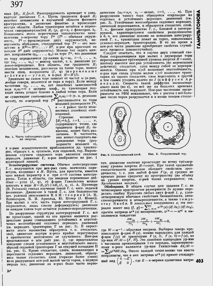 Неинтегрируемыс системы. Обычно интегрируемые Г. с. получаются при не к-рых спец. значениях параметров, входящих в Н. Пусть, для простоты, имеется один малый параметр е и при Б≈0 система интегрируема. Тогда в области, где введены переменные дей-ствне ≈ угол </, ф), е╦ ф-цию Гамильтона можно заплсать в виде Я ≈ Я,)(/)-г-еЯ1 (/, ф, е). Л. Пуанкаре (Н. Poincare) считал изучение такой Г. с. «осн. задачей динамики». Движение в такой Г. с, для большинства нам, условий описывается КЛМ-теорие и [Л. Н, Колмогоров, В. И. Арнольд, Ю- Мояер (J. Moser)]. При малых 8 осн. часть торов интегрируемой Г. с. сохраняется, лишь слегка деформируясь; движение на каждом таком торе оста╦тся условно-периодическим.