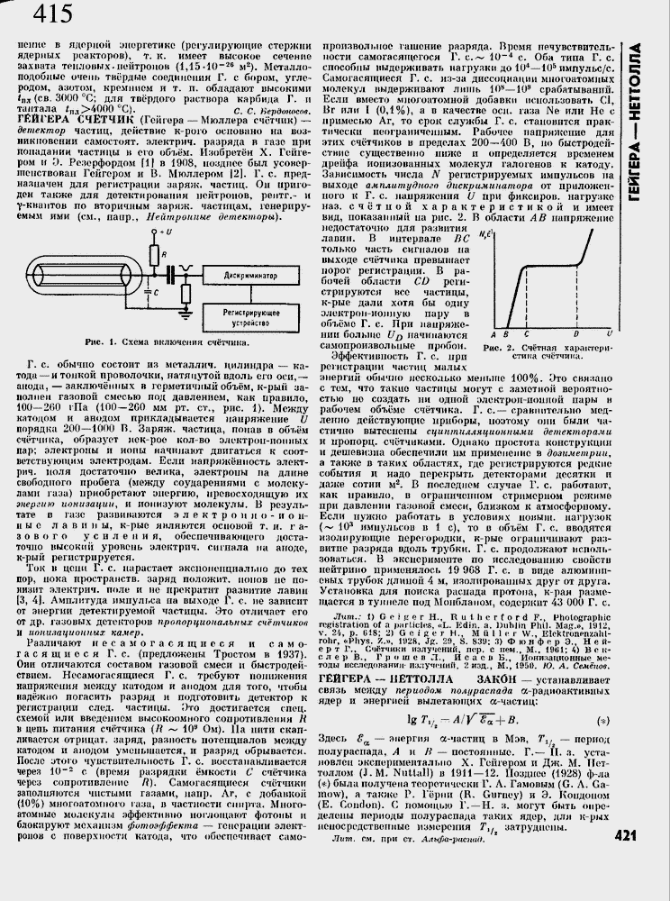 энергий обычно несколько меньше 100%. Это связано с тем, что такие частицы могут с заметной вероятностью не создать ни одной электрон-ионной пары м рабочем объ╦ме сч╦тчика. Г. с.≈ сравнительно медленно действующие приборы, поэтому они были частично вытеснены сщишпилляциоппыми детекторами. и иропорц. сч╦тчиками. Однако простота конструкции и дешевизна обеспечили им применение в дозиметрии, а также в таких областях, где регистрируются редкие события и надо перекрыть детекторами десятки и даже сотни м2. В последнем случае Г. с. работают, как правило, в ограниченном стримсрном режиме при давлении газовой смеси, близком к атмосферному. Если нужно работать в условиях поньгш. нагрузок (~ ╧ импульсов в 1 с), то в объ╦м Г. с. вводятся изолирующие перегородки, к-рые ограничивают развитие разряда вдоль трубки. Г, с. продолжают использоваться. В эксперименте по исследованию свойств нейтрино применялось 19 908 Г. с. в виде алюминиевых трубок длиной 4 м, изолированных друг от друга. Установка для поиска распада протона, к-рал размещается в тулнсле под Монбланом, содержит 43 000 Г. с.