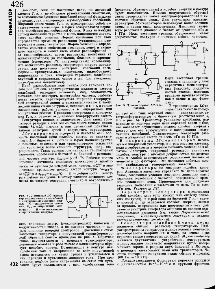 (положит, обратная связь) и колебат. энергия в контуре будет пополняться. Помимо индуктивной обратной связи применяются также автотрансформаторная и ╦мкостная обратная связь. Для улучшения электрич. параметров £6т-генераторов используют более сложные схемы и лампы спец. конструкции. Ламповые генераторы работают в диапазоне частот от десятков кГц до 1 ГГц. Ниж. частотная граница обусловлена малой добротностью контуров с низкими собств. частотами.