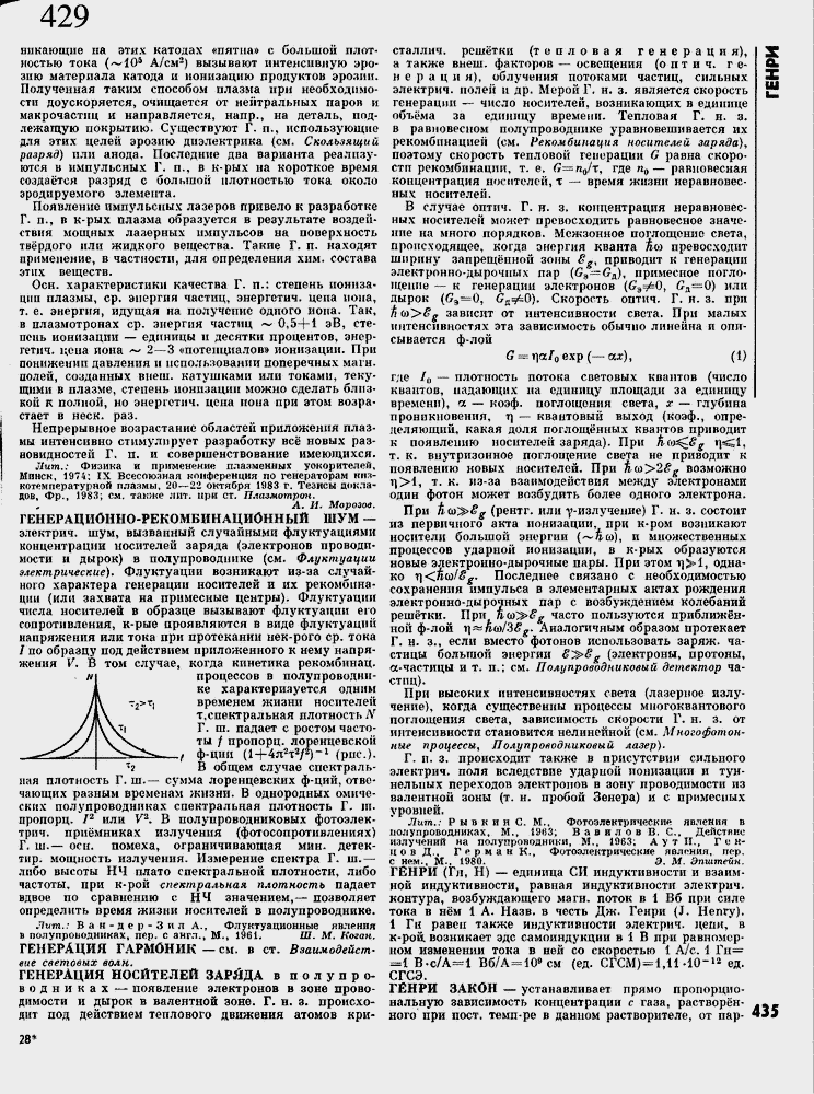 процессов в полупроводнике характеризуется одним временем жизни носителей т,спектральная плотность N Г. гл. падает с ростом частоты / пропорц. лоренцевской f ф-ции (1 ≈ 4л2т2/2)"1 (рис.). В общем случае спектральная плотность Г. ш.≈ сумма лорснцевских ф-ций, отвечающих разным временам жизни. В однородных омических полупроводниках спектральная плотность Г. пт. пропорц. I2 или V2. В полупроводниковых фотоэлек-трич. при╦мниках излучения (фотосопротивлениях) Г. ш.≈ осн. помеха, ограничивающая мин. детек-тир. мощность излучения. Измерение спектра Г. ш.≈ либо высоты НЧ плато спектральной плотности, либо частоты, при к-рой спектральная плотность падает вдвое по сравнению с НЧ значением,≈ позволяет определить время жизни носителей в полупроводнике.